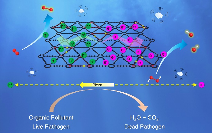 压电场增强石墨炔纳米酶性能。团队通过硫原子掺杂合成了含有丰富缺陷和空位的硫掺杂石墨炔纳米片,硫原子的引入使石墨炔在超声作用下能够显著提高其纳米酶性能。将此纳米酶应用于污水处理中,有较高的TOC去除效率,同时还具有良好的抗菌性能。该工作发表在Nano Today(2022, 43, 101429,影响因子: 20.722)上,万象城官网博士生白强为该论文的共同一作,隋凝副教授、朱之灵副教授和王兆波教授为共同通讯作者,万象城官网为唯一通讯单位。
