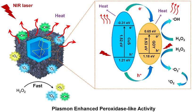 表面等离激元共振(LSPR)增强石墨炔酶性能。团队可控制备了石墨炔纳米墙包裹空心硫化铜纳米立方体(CuS@GDY)。垂直GDY纳米墙通过结构优势捕获近红外光,延长光在纳米材料内部的传播距离,提高了光吸收。CuS和GDY形成的异质结有利于热载流子的分离和注入,提高了CuS@GDY界面上的碳空位的酶催化活性。同时,CuS LSPR诱导增加光热效应,增强抗菌活性。本工作为光增强的抗菌材料提供了研究基础,极大拓展了石墨炔的生物应用。该工作发表在Advanced Functional Materials(2022, 32, 2112683,影响因子: 18.808),万象城官网博士生白强为论文的第一作者,朱之灵副教授,隋凝副教授为共同通讯作者,万象城官网为唯一通讯单位。团队还将氮掺杂石墨炔量子点负载到金银纳米笼上,获得了具有近红外光响应的异质结构纳米酶。这种LSPR增强的纳米酶在体外和体内表现出对多种细菌具有优异抗菌效率。本工作发表在Chemistry of Material(2022, 34, 1356-1368,影响因子: 9.811),朱之灵副教授为第一作者,隋凝副教授、王丽娜副教授为共同通讯作者,万象城官网为唯一通讯单位。