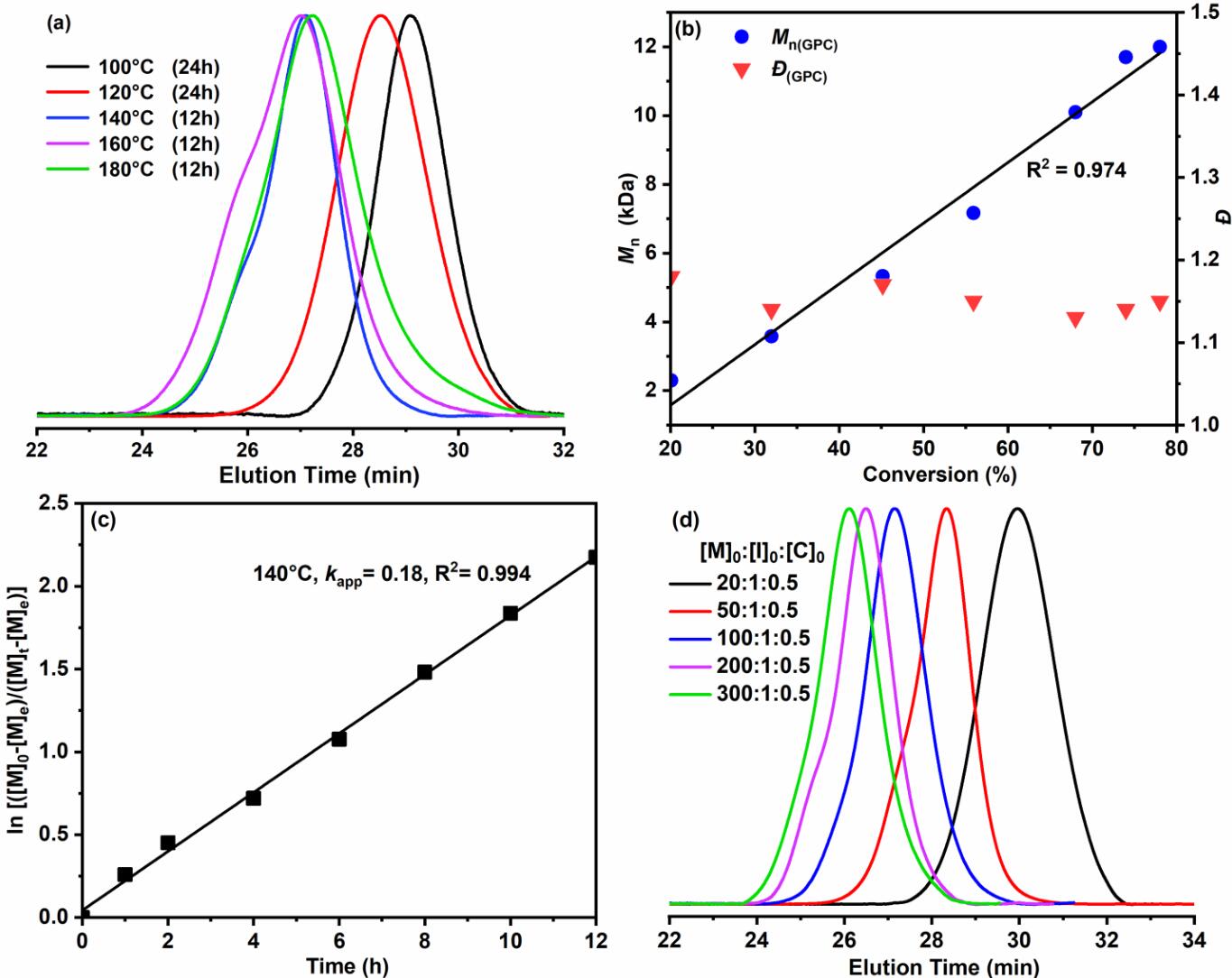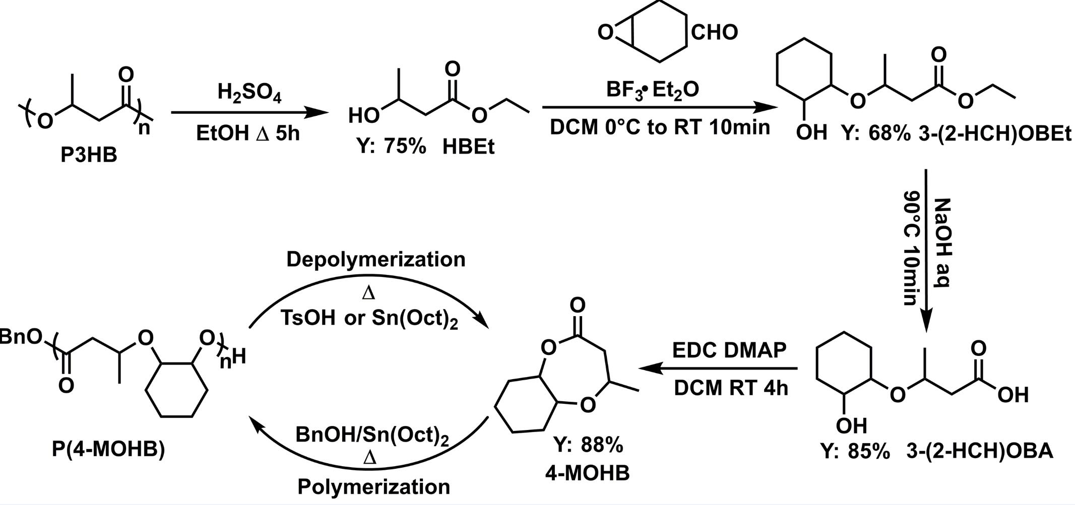 作者首先利用硫酸为催化剂,将P3HB醇解为3-羟基丁酸酯,然后与环氧环己烷反应,最后经过皂化和环化反应得到环状醚酯单体(4-MOHB)。整个转化过程高效、操作简单,单体仅需通过减压蒸馏的方式纯化,避免了复杂的柱层析纯化操作。利用辛酸亚锡为催化剂,苄醇为引发剂,4-MOHB可以在本体条件下开环聚合制备得到具有良好热稳定性的聚醚酯材料。聚合表现为一级动力学,所得聚合物端基、分子量及其分布可控。