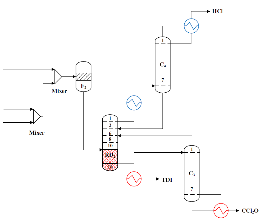 甲苯二异氰酸酯(TDI)是生产聚氨酯的重要材料之一,在泡沫塑料、弹性体、涂料和粘合剂等领域具有广泛应用,国内外TDI工业化大都通过冷光气化和热光气化两步反应合成。目前绝大部分研究集中在冷光气化步骤,而对热光气化反应研究较少。热光气化反应过程速率较慢且伴随复杂副反应的发生,是一个能源密集型复杂的反应精馏过程,其性能的好坏对整个反应系统的选择性和收率具有重要影响,因此对该步骤进行优化具有重要意义。