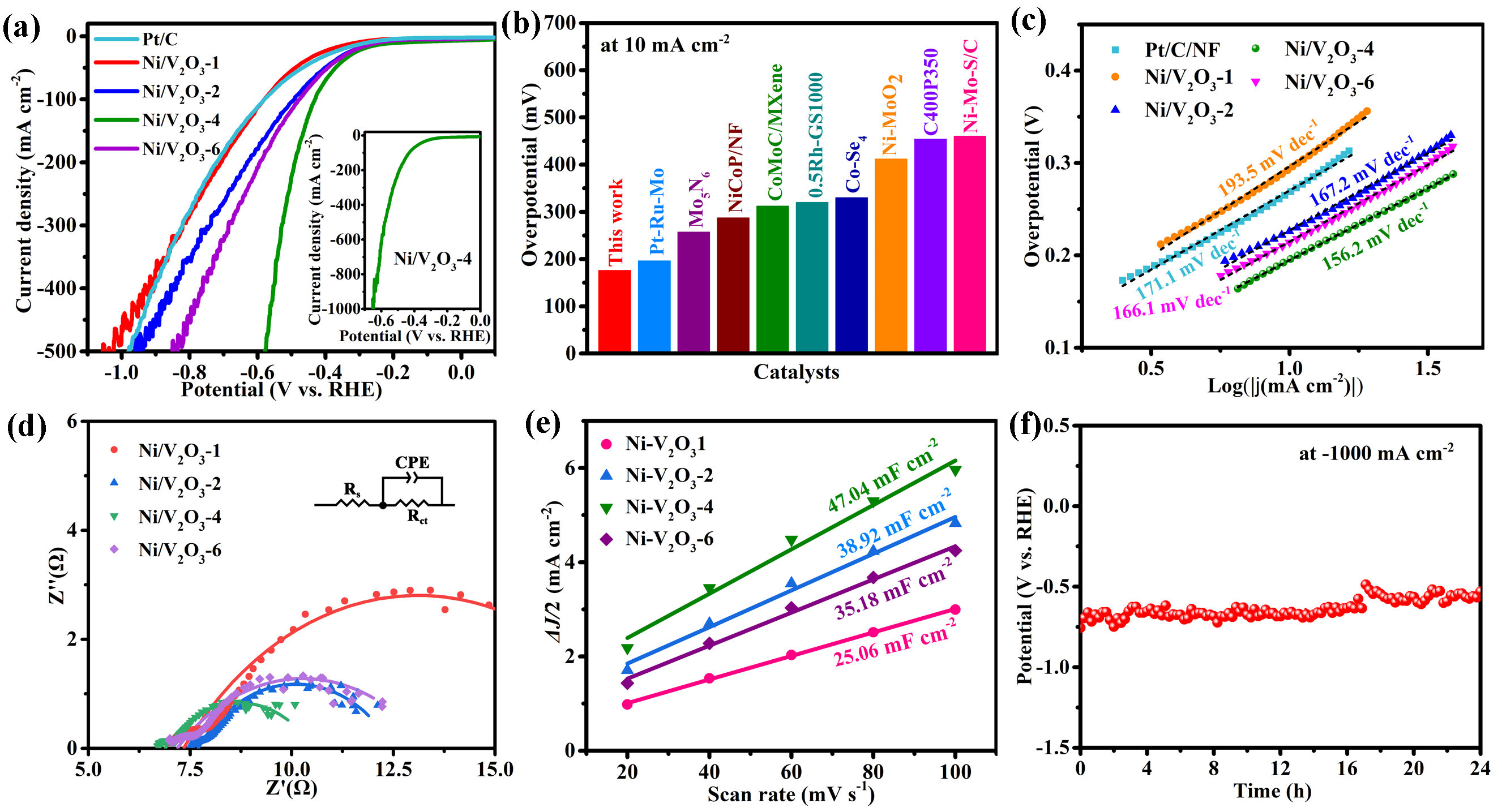 图2三维Ni/V2O3肖特基电极对海水析氢的性能