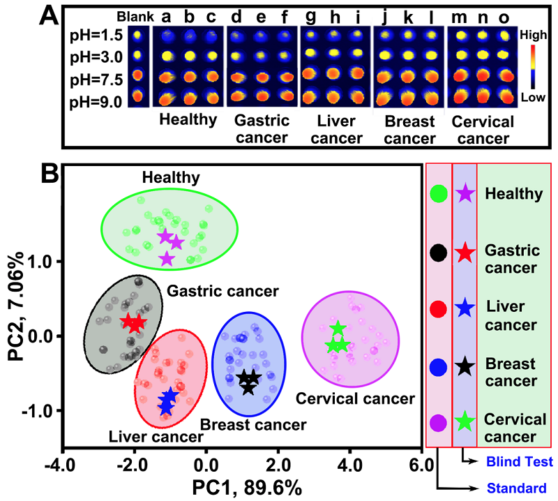 为了解决这一问题,万象城官网本科三年级丁稼祥同学自大二暑假开始进入化学与分子工程学院徐升豪、罗细亮教授课题组进行科研攻关,开发了一种pH值编程的荧光传感阵列(图1),实现了健康人与胃癌、肝癌、乳腺癌以及直肠癌病人血浆的直接鉴定区分(图2)。同时,15例未知癌症血浆样本也被准确地被鉴定区分,该工作为癌症等重大疾病的早期筛查提供了快速、简便且有效的新方法。