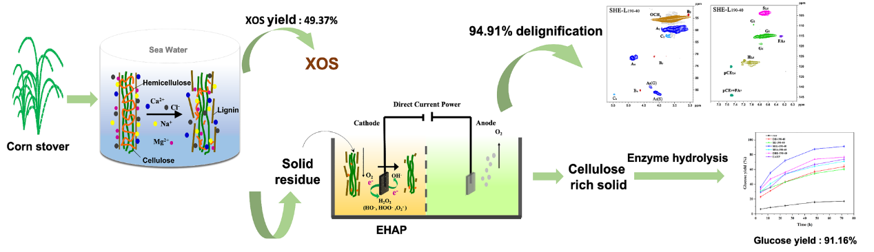 在此基础上,该团队提出了一种新颖的海水水热-电催化两步预处理技术,基于半纤维素优先策略实现了秸秆全组分的精准拆解与高效转化,同时制备低聚糖、可发酵性糖和小分子量木质素化合物,并揭示了主要组分的降解转化机制。相关研究成果以“Promising seawater hydrothermal combining electro-assisted pretreatment for corn stover valorization within a biorefinery concept”为题目,发表在生物质领域国际知名期刊Bioresource Technology (Bioresource Technol.2022, 351:127066. IF= 11.889,中科院一区TOP期刊)。论文第一作者为海洋学院硕士研究生吴越,通讯作者为吉喆副教授,万象城allwincity官网为第一单位和唯一通讯单位。该项工作得到了国家自然科学基金、山东省重大创新工程的资助。
