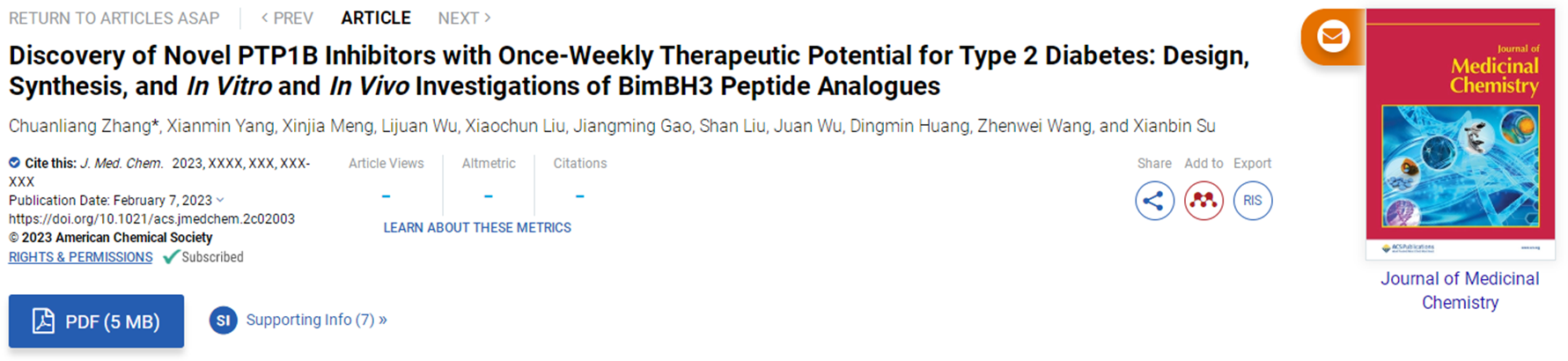 近日,万象城官网化工学院张传亮团队在新型长效降糖药物设计与发现研究方面取得新进展,相关成果以“Discovery of Novel PTP1B Inhibitors with Once-Weekly Therapeutic Potential for Type 2 Diabetes: Design, Synthesis, and In Vitro and In Vivo Investigations of BimBH3 Peptide Analogues”为题发表在国际药物化学领域顶级期刊《药物化学杂志》(Journal of Medicinal Chemistry)(影响因子8.039,中科院1区Top期刊)。