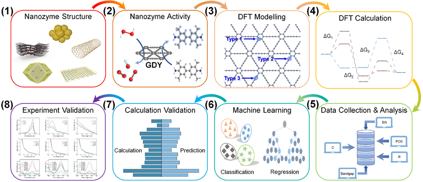 石墨炔(Graphdiyne,GDY),是继富勒烯、碳纳米管、石墨烯之后,一种新的全碳纳米结构材料,具有丰富的碳化学键、大的共轭体系、宽面间距、优良的化学稳定性,被誉为是最稳定的一种人工合成的二炔碳的同素异形体。自从发现石墨炔具有优良的纳米酶活性后(Chem. Eng. J. 2021, 413, 127537,ESI高被引论文;Adv. Funct. Mater. 2022, 32, 2112683,ESI高被引论文;Nano Today 2022, 43, 101429,ESI高被引论文;J. Colloid Interface Sci. 2022, 607, 22169-22181;Nano Res. 2022, 15, 1446-1454;Chem. Mater. 2022, 34, 1356-1368;ACS Appl. Mater. Interfaces 2022, 14, 26455-26468;ACS Appl. Mater. Interfaces 2022, 14, 27720-27732),本团队一直致力于高活性新型石墨炔基纳米酶的开发。然而,传统纳米酶的设计开发面临逐一筛选效率低下的挑战,如何通过合理设计,或者采用理性化、自动化的方法,加速新型石墨炔基纳米酶的发现,成为了摆在研究人员面前的难题。借助人工智能手段,特别是机器学习(Machine Learning)来预测材料性能是一个富有潜力的解决方案,有望加速石墨炔基纳米酶的发现。