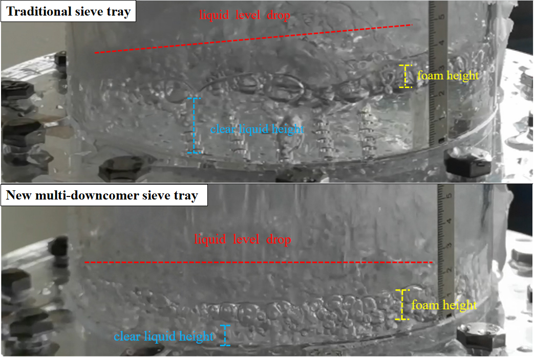 同时,王伟文团队将理论研究成果推广至气液传质塔板研发工作中,阐释了气泡受迫破碎机制和规律,提出了“液滴破泡”的气泡调控方法,发明了一种新型多降液管微气泡塔板,改善了两相接触,大幅度提高了气液相界面积,可高效实现工业生产分离过程强化。该工作以“A new gas-liquid mass transfer enhancement method for a multi-downcomer sieve tray: Bubble breakup by falling droplets”为题发表在流体力学领域Top期刊Physics of Fluids上(doi:10.1063/5.0131700),万象城allwincity官网为论文的唯一单位。