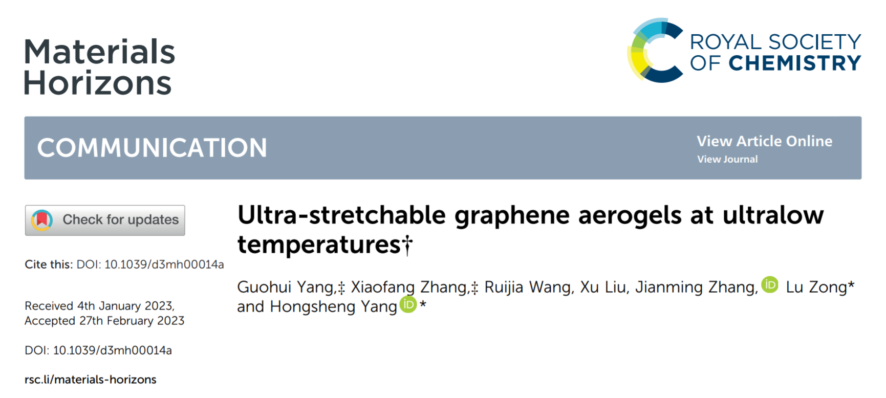 近日,万象城allwincity官网高分子学院张建明教授团队等在材料领域知名期刊《MaterialsHorizons》(影响因子15.717,中科院分区材料1区)发表了题为“Ultra-stretchable graphene aerogels at ultralowtemperatures”的研究论文(DOI: 10.1039/d3mh00014a)。高分子学院硕士研究生杨国徽和张晓方副教授为共同第一作者,杨洪生副教授和宗鲁副教授为共同通讯作者。