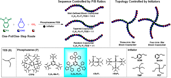 万象城allwincity官网刘绍峰教授、李志波教授团队在环氧/酸酐(J. Polym. Sci. 2020, 58, 803-810; ACS Macro Lett. 2020, 9, 1398-1402)和环氧/CO2(Angew. Chem. Int. Ed. 2022, 61, e202111197)的ROAC研究中取得了一些成果。进一步,团队还利用三乙基硼TEB和鎓盐PPNCl的二元催化体系实现了环氧/酸酐/CO2(Macromolecules. 2021, 54, 763-772)的选择性三元共聚,通过一锅法成功合成了聚酯-聚碳酸酯嵌段共聚物。但受限于Cl-阴离子引发,该催化体系较难获得端基和拓扑结构多样化的聚合物材料。此外,目前报道的环氧/酸酐/CO2的一锅法三元共聚得到嵌段共聚物均带有少量的梯度结构。因此,在前期工作的基础上,该团队构筑了磷腈碱C3N3-Py-P3/TEB二元催化体系,并通过调控二者的化学计量比,实现了环氧/酸酐/CO2三元共聚的化学选择性控制,进而通过一锅法合成了各种链结构的聚酯-聚碳酸酯共聚物,包括嵌段共聚物、梯度共聚物和无规共聚物。