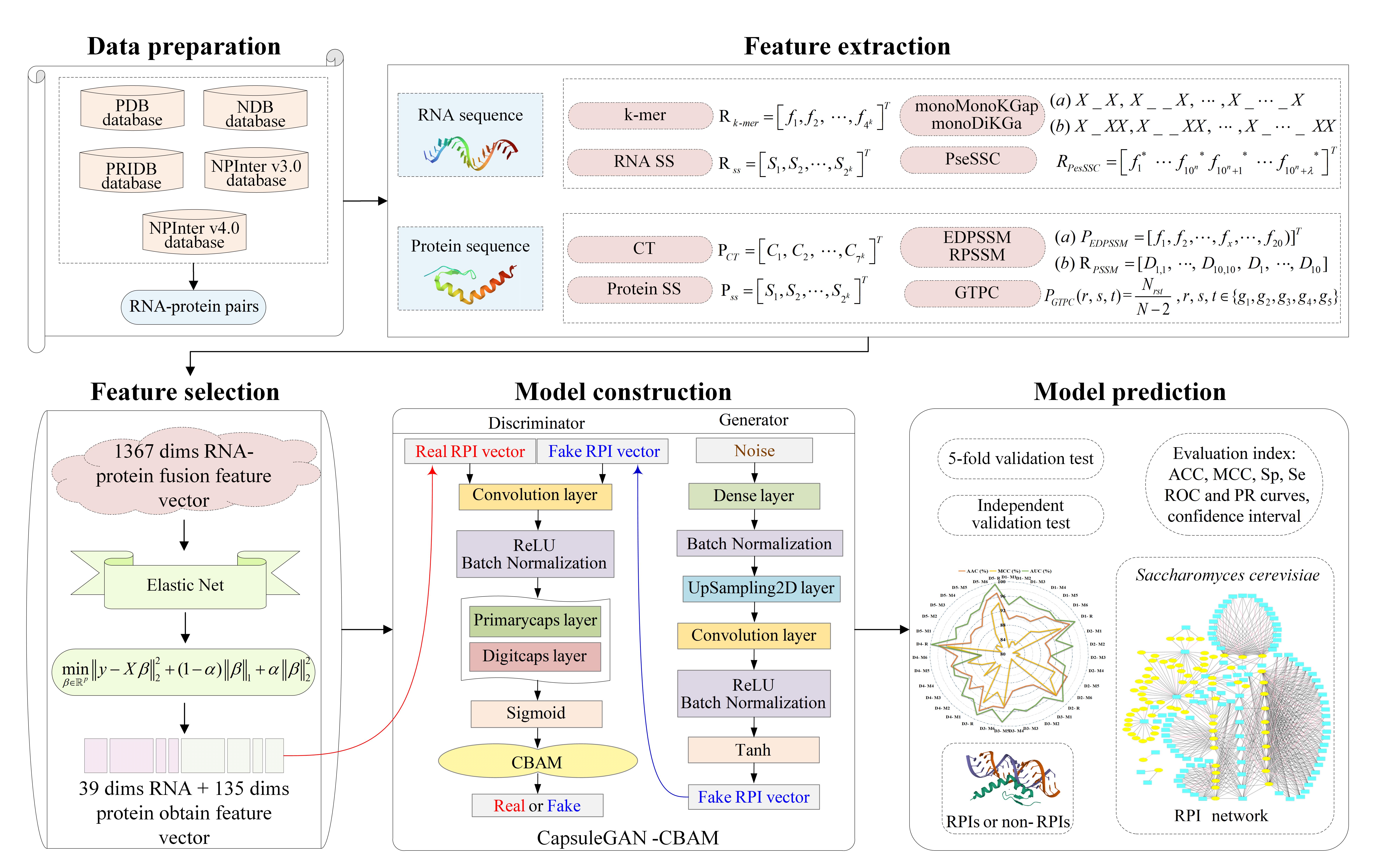 本研究首次将卷积注意力机制引入生成对抗胶囊网络构建RNA-蛋白质相互作用预测模型框架。其中,生成对抗胶囊网络中生成器和判别器两个模型经过不断博弈,可有效解决训练过程中存在的样本数据量不足、稳定性不够以及模型空间结构层次消失等问题。卷积注意力机制通过为每个输入特征分配权重优化特征空间,可配合生成对抗胶囊网络算法进一步提高模型的可解释性,实现对RPI更高效、更精准、更稳定的预测。在5折交叉验证测试中,RPI-CapsuleGAN模型在数据集RP1488、RPI369、RPI2241、RP11807和RPI1446上优于其它现有RPI预测算法。六个不同物种的独立测试集结果表明基于生成对抗胶囊网络的深度学习算法具有较好的模型泛化能力。本文提出的RPI-CapsuleGAN模型,不仅为探索数以百万计的潜在RNA-蛋白质相互作用对提供一定见解和参考,同时也为相关性疾病机理研究提供重要线索和理论依据,有望为新药研发和疾病治疗提供指导。