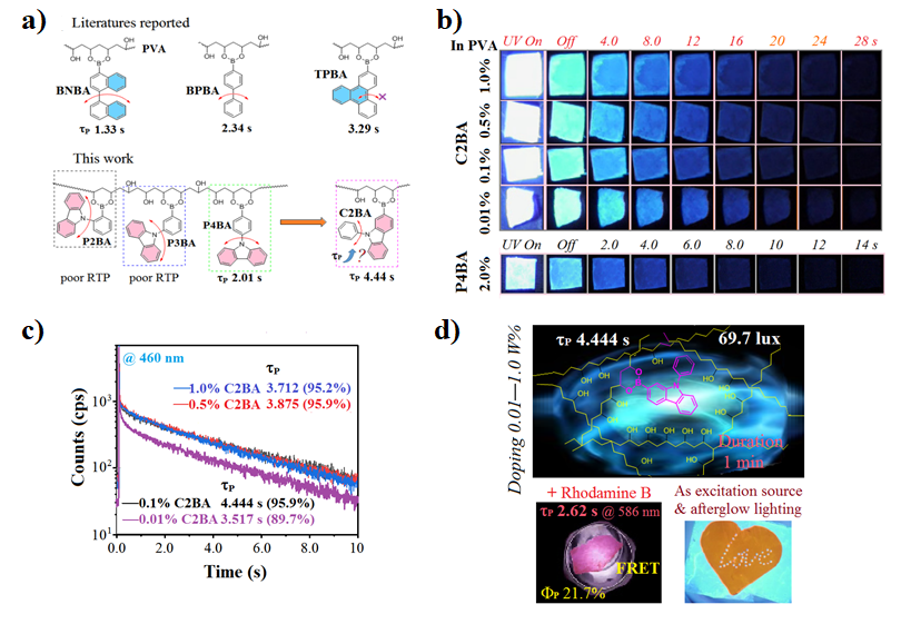 本团队考虑芳香族硼酸和咔唑基结合在超长有机掺杂RTP聚合物中将发挥积极作用,最近将N-(对硼酸苯基)咔唑掺杂进PVA取得了长组元寿命为3.21 s的RTP聚合物(Chem. Eng. J.,2023,452,139385)。本工作首次通过异构化硼酸基到咔唑环,实现了更加超长的RTP发射。这些结果表明,将功能基团直接键接在三线发色团,不仅能有效抑制三线态热失活,而且可大大降低分子内旋转对三线态激发能的耗散作用。这提供了一个有机室温磷光掺杂剂分子设计和应用的新思路(图a)。经过这一分子结构改性策略,只需在PVA分子链上接枝万分之一或千分之一的9-苯基咔唑-2-硼酸(C2BA),就可获得了创纪录的达3.517和4.444秒的超长RTP寿命(图b,c)。