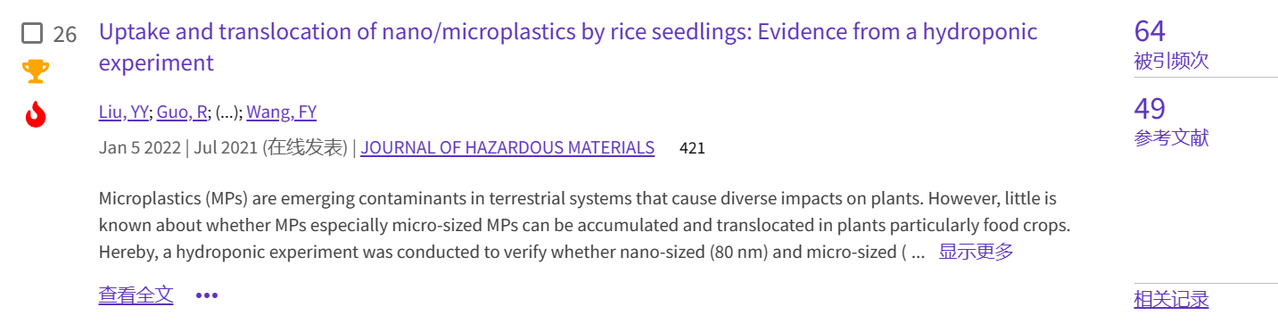 (3)论文3发表于环境类top期刊《Journal of Hazardous Materials》(https://doi.org/10.1016/j.jhazmat.2021.126700),累计被引64次。该文报道了水培条件下水稻对纳米和微米级聚苯乙烯塑料的吸收和转运,并探讨了相关吸收和转运机制,为认识微塑料的植物毒性提供了证据。