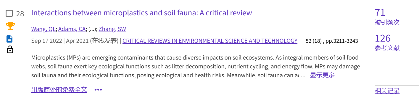 (4)论文4发表于环境类综述期刊《Critical Reviews ion Environmental Science and Technology》(https://doi.org/10.1080/10643389.2021.1915035),累计被引71次。该文系统评述了微塑料在对土壤动物的毒性效应及其机制,并探讨了当前研究的不足,指明未来需要优先研究的方向。