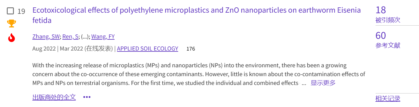 (2)论文2发表于土壤学主流期刊《Applied Soil Ecology》(https://doi.org/10.1016/j.apsoil.2022.104469),累计被引18次。该文报道了聚乙烯微塑料和纳米氧化锌对蚯蚓的毒性效应,为认识微塑料和镉在土壤中的生态毒理学效应提供依据。此外,王发园教授担任该刊编委,组织“土壤微塑料”主题专刊,累计发表土壤微塑料领域相关论文20篇。