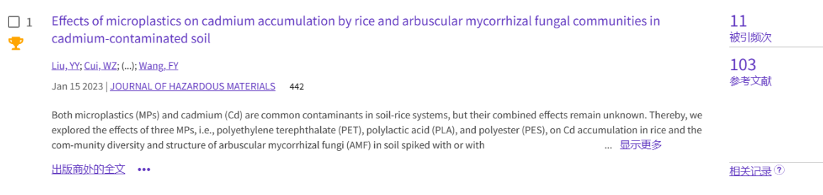 (1)论文1发表于环境类top期刊《Journal of Hazardous Materials》(https://doi.org/10.1016/j.jhazmat.2022.130102),累计被引11次。该文报道了不同微塑料对镉污染土壤中水稻对镉的积累及丛枝菌根真菌群落的影响,为认识微塑料和镉在稻田中的生态风险提供依据。