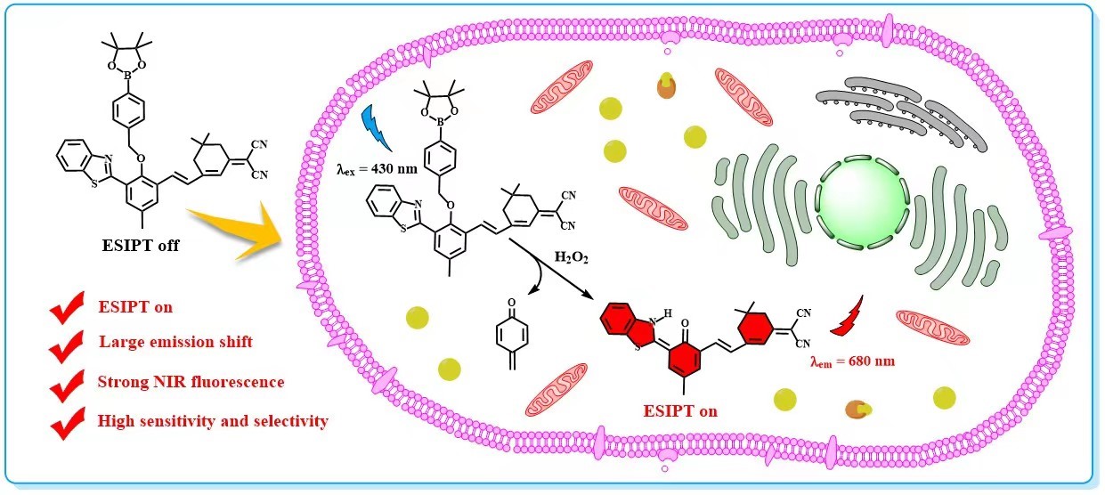 过氧化氢(H2O2)是生物体内常见的活性氧物种之一,对细胞信号传导、机体免疫反应等正常生理功能的实现具有重要作用,被视为是阿尔兹海默症、肿瘤、心血管疾病、亨廷顿病和帕金森病等多种疾病的重要生物标志物。近日,海洋科学与生物工程学院王晓春教授团队在国际著名期刊《Sensors and Actuators B:Chemical》(JCR中科院一区Top)发表了题目为“H2O2-targeted ratiometric chemosensor with long-wavelength emission and large emission shift based on ESIPT mechanism for bioimaging application”的研究论文(Sensors & Actuators: B. Chemical,2023,393,134301)。该论文第一作者为课题组2020级硕士研究生陈瑾,王晓春教授为独立通讯作者,万象城allwincity官网为独立通讯单位。