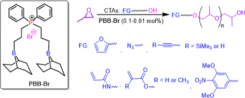 化工学院王晓武、李志波团队近年来开发了一系列有机硼路易斯酸碱对体系并成功应用于开环聚合中(Polym. Chem.,2022,13, 6551-6563;Chinese J. Polym. Sci.2023,41, 735–744)。团队首次报道了分子内磷盐双硼路易酸碱对PBB-Br,并实现了PO单体的可控/活性聚合。更为重要的是,PBB-Br可在H2O作为链转移条件下制备α,ω-双羟基PPO(ACS Catalysis2022,12, 8434−8443)。在上述工作基础上,研究团队采用PBB-Br作为有机催化剂,使用不同官能化的醇作为链转移剂,进行PO的“不死”ROP,实现了α,ω-双官能化PPOs的制备,合成的聚合物具有窄的分子量分布、分子量可控及无金属等特点。该工作极大地拓展了官能化聚醚多元醇的种类和用途。