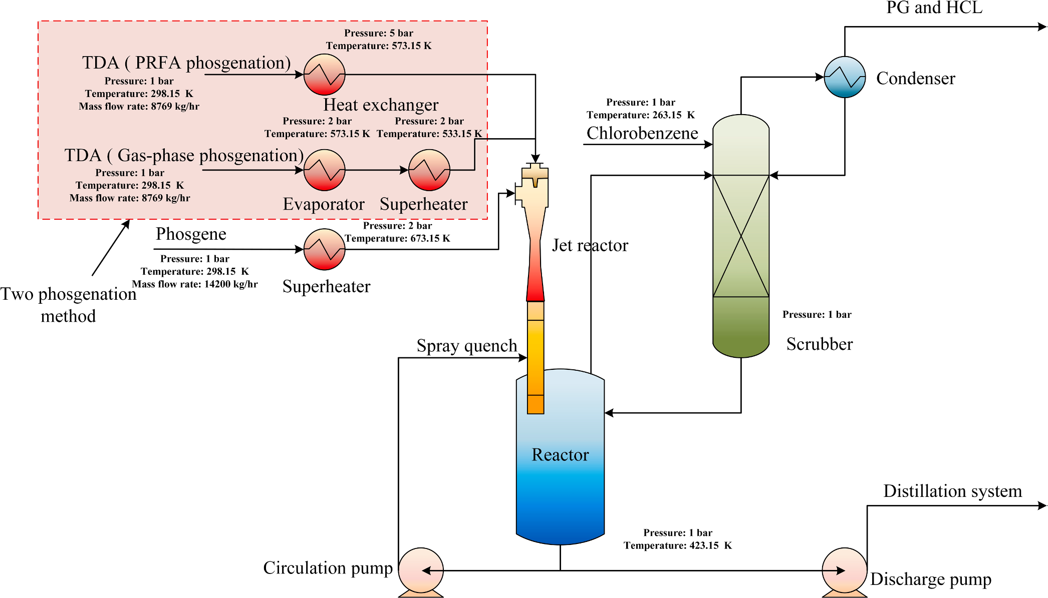 通过对PRFA工艺流程(图2)进行模拟分析,并与主流工艺进行综合分析对比,发现PRFA法在TDA液滴寿命、反应温度、液滴尺寸变化、反应界面更新等方面具有明显的优势。在新工艺下,光气化反应过程中的能耗也大大降低,平均和最高反应温度比目前工业上使用的最先进的气相法温和得多,这些发现从技术、经济和环境方面证明了新的PRFA工艺的具有很好的应用前景。