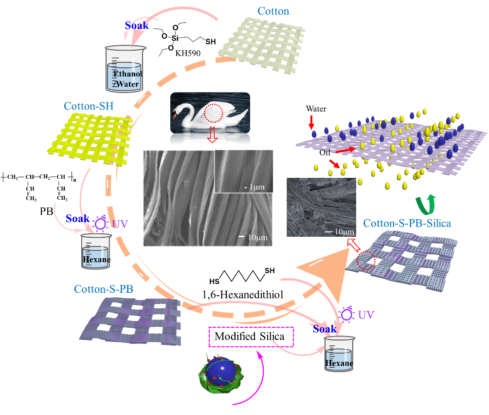 更多信息请参见Progress in Organic Coatings(中科院一区TOP)期刊上“Swan feather-spired fluorine-free superhydrophobic self-cleaning cotton cloth with strong oil-water separation function”为题发表的论文(https://doi.org/10.1016/j.coco.2023.101566)。第一作者为万象城allwincity官网高分子科学与工程学院博士研究生刘玉冬,通讯作者为华静教授。此研究工作得到了山东省自然科学基金的支持。