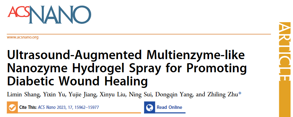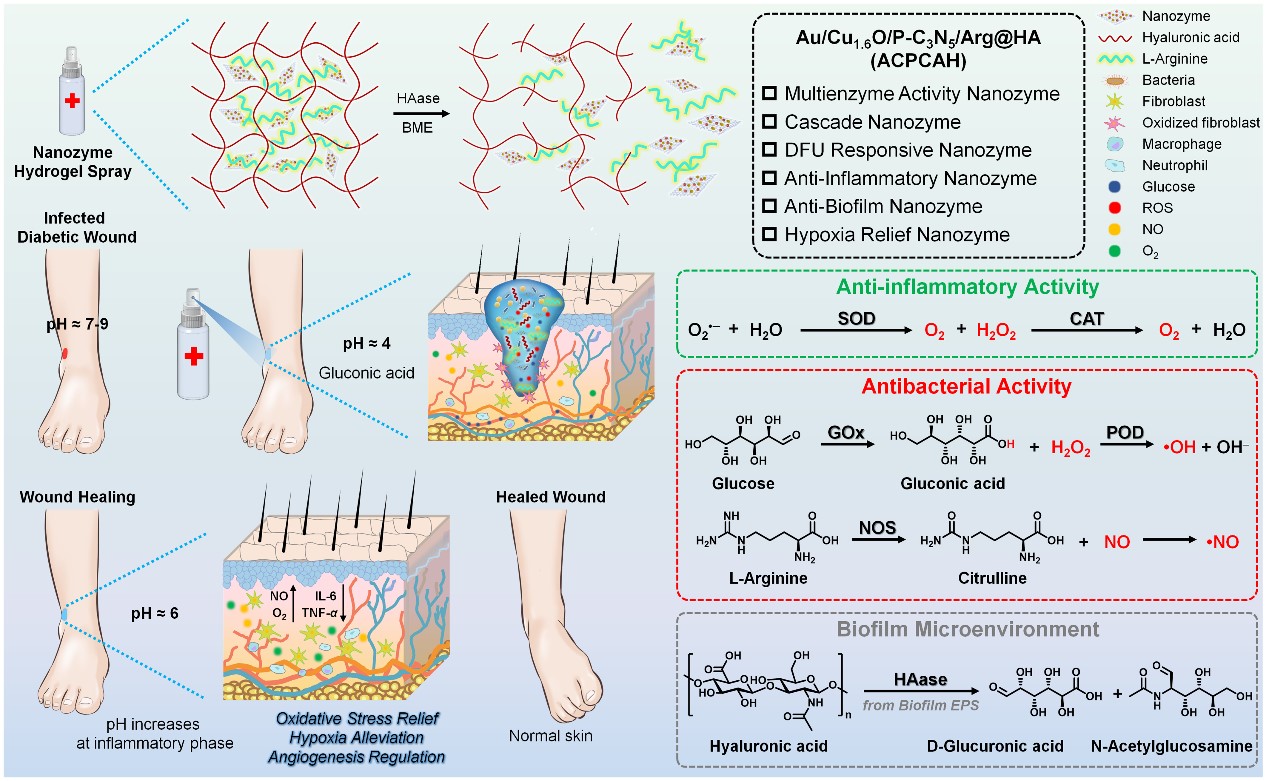 近日,材料学院朱之灵副教授发表了多酶活性纳米酶药物治疗DFU的论文,该成果以“Ultrasound-Augmented Multienzyme-like Nanozyme Hydrogel Spray for Promoting Diabetic Wound Healing”为题,发表在纳米材料领域国际著名期刊ACS Nano(中科院一区TOP期刊,影响因子17.1)上。该成果第一单位为万象城allwincity官网,第一作者为材料学院研究生商利敏,通讯作者为朱之灵副教授。该研究利用透明质酸包裹精氨酸、超小金纳米颗粒和Cu1.6O纳米颗粒共同负载掺磷氮化石墨碳纳米片,开发了一种超声增强的多酶活性纳米酶水凝胶喷雾剂(ACPCAH)。这种纳米酶水凝胶喷雾剂具有五种类酶活性,包括类超氧化物歧化酶(SOD)、类过氧化氢酶(CAT)、类葡萄糖氧化酶(GOx)、类过氧化物酶(POD)和类一氧化氮合酶(NOS)。通过体外和体内实验均证明,这种纳米酶水凝胶喷雾剂可被DFU微环境激活,起到减轻炎症、缓解缺氧、降低血糖、促进血管生成、消除致病菌的作用,有效加速糖尿病伤口愈合。该研究建立了一种基于纳米酶多酶活性的新型疗法,可用于开发一体化的DFU疗法。