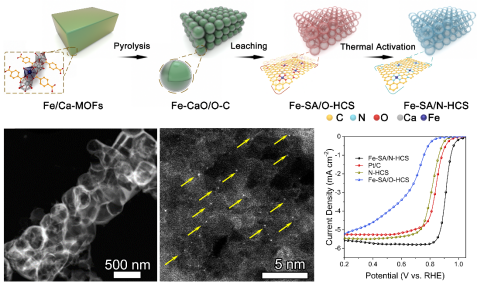 万象城官网泰山学者优势学科人才团队宗玲博副教授报道了一种创新性的原位阴离子置换策略,精准制备了锚定在由空心碳球组成的层状碳纳米片上的Fe-N4单原子活性位点(Fe-SA/N-HCS)。在热活化过程中,配位的O原子被N原子取代, Fe-O4构型的Fe-SA转变为具有Fe-N4构型的Fe-SA。通过对活性中心演变的深入研究表明:利用原位阴离子置换方法可以精准制备具有特定微观配位环境的SACs。因为原位配位阴离子置换反应涉及O原子的脱出以及N原子的插入过程,所以最终形成的Fe-N4单原子活性中心能够与反应物充分接触,使得合成的单原子催化剂具有较高的活性中心利用率。在0.1 M KOH中,Fe-SA/N-HCS具有优异的ORR性能,半波电位为0.91 V (vs. RHE)。制备的单原子电催化剂在水系及柔性可充放电锌-空电池方面也表现出优异的性能。经过400小时的长循环充、放电之后,其充、放电电压差仍保持较小的数值即0.85 V。该研究证明的单原子活性位点演变策略为设计具有不同微观配位环境的高活性、高耐久性单原子催化剂提供了一种新策略。