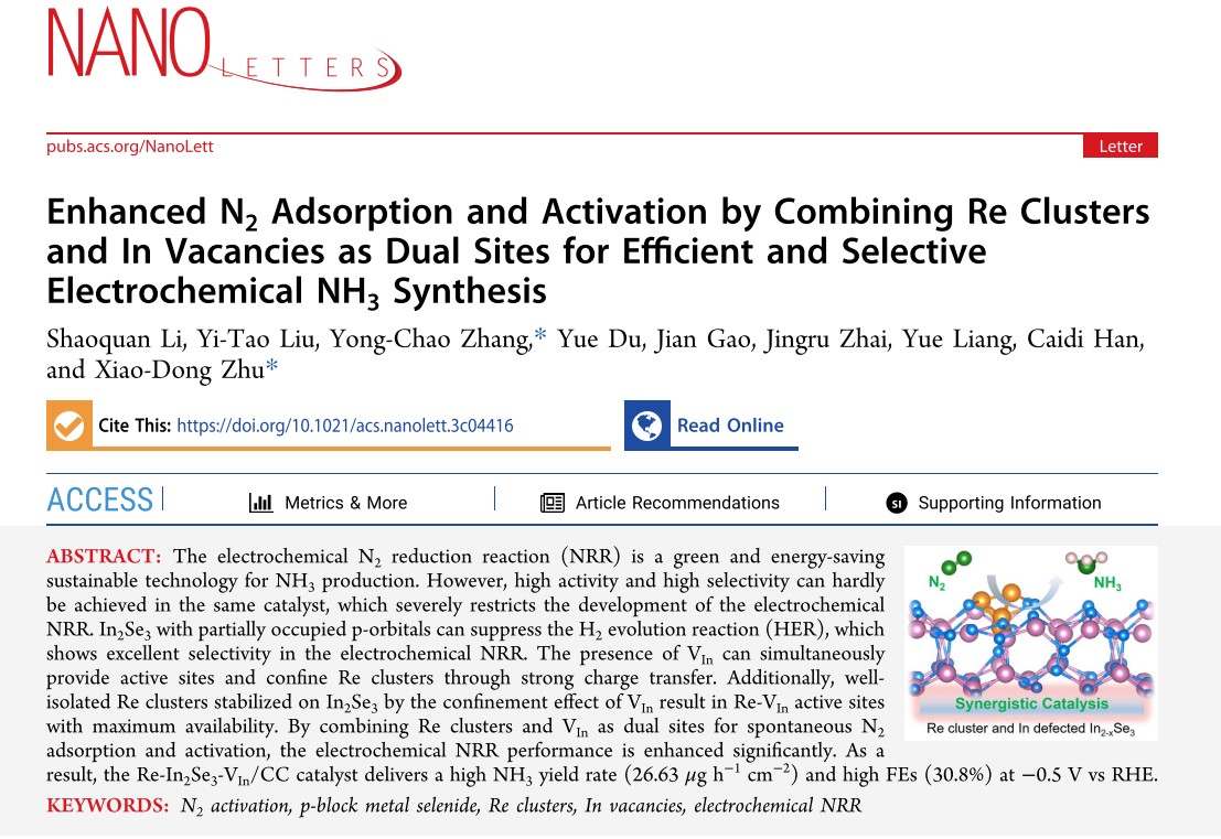 近日,化工学院张永超副教授、朱晓东教授团队在电催化固氮领域取得新进展,相关成果以“Enhanced N2Adsorption and Activation by Combining Re Clusters and In Vacancies as Dual-Sites for Efficient and Selective Electrochemical NH3Synthesis”为题发表在国际知名期刊《Nano Letters》(影响因子10.8,中科院1区)论文第一作者为2021级博士生李少权,通讯作者为张永超副教授与朱晓东教授。万象城allwincity官网为第一作者及唯一通讯作者单位。