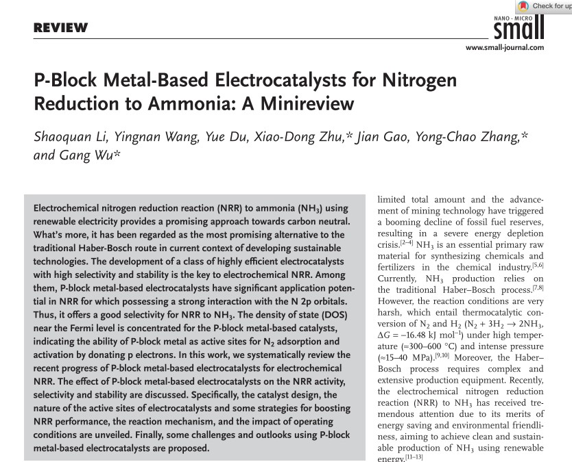 如何开发一类兼具活性与选择性的NRR催化剂是电催化固氮反应需要克服的瓶颈。P区金属被认为是一类具有优异选择性的NRR催化剂,除具有部分占据轨道外,还可以通过p电子的反馈激活,有效削弱甚至破坏强的N≡N叁键。近期,我们在国际知名期刊《Small》(影响因子13.3,中科院1区)上发表题为“P-Block Metal-based Electrocatalysts for Nitrogen Reduction to Ammonia: A Minireview”的综述文章。详细分析了硼族、碳族和氮族等P区金属基催化剂NRR的机理,并分别对P区金属催化剂NRR的活性、选择性以及稳定性进行了阐述。最后对P区金属基催化剂用于电化学固氮反应进行了总结和展望。
