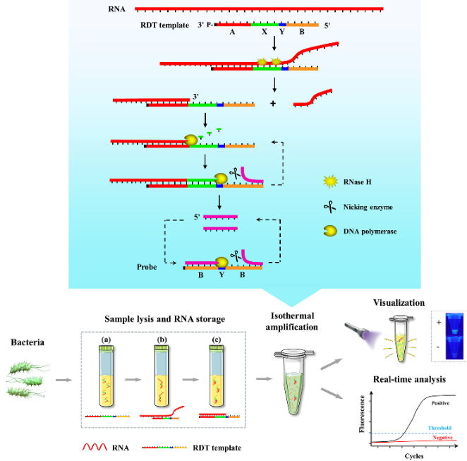 病原体的准确检测对于临床诊断和生物医学研究具有重大的意义,基于DNA检测聚合酶链式反应(Polymerase chain reaction, PCR)技术作为病原体检测的金标准,具有高灵敏、高特异性的优点,但存在无法区分病原体生存状态的问题;相比之下,RNA具有半衰期短、丰度高的特点,基于RNA的检测可以选择性地检出具有转录活性的病原体。针对病原菌的高灵敏、快速检测问题,马翠萍教授团队构建出一种新型等温RNA检测技术,该技术基于DNA/RNA嵌合探针触发指数扩增反应,检测结果可以通过便携式紫外灯即可进行判读,且无需精密的温度控制装置(图1)。另外,该技术可以实现靶标RNA区域的短期保护,即使在RNA酶存在的条件下,该技术至少可以保证36小时内RNA不会发生降解,避免了由于靶标降解造成的假阴性问题。该平台对于大肠杆菌RNA的检测限为1fg/μL,对于牛奶中大肠杆菌的检测限为1.0×102CFU/mL,检测过程40分钟之内即可完成,不依赖于复杂的检测设备,有望成为临床诊断和食品安全检测领域强有力的RNA检测工具。