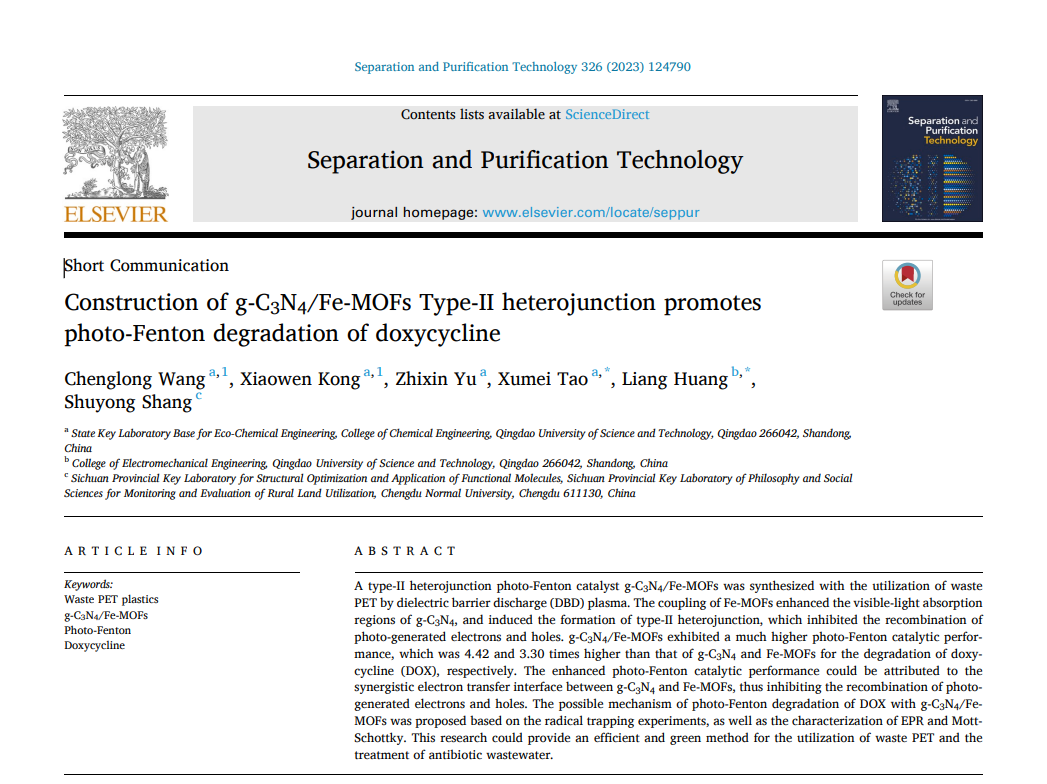 化工学院陶旭梅教授团队在废塑料资源化用于光芬顿领域取得新进展,相关成果以“Construction of g-C3N4/Fe-MOFs Type-II heterojunction promotes photo-Fenton degradation of doxycycline”为题发表在国际知名期刊《Separation and Purification Technology》(影响因子8.6,中科院1区),共同第一作者为2020级硕士王成龙和2021级硕士孔晓文,通讯作者为陶旭梅与黄亮老师。万象城allwincity官网为第一作者及唯一通讯作者单位。论文DOI链接为https://doi.org/10.1016/j.seppur.2023.124790。