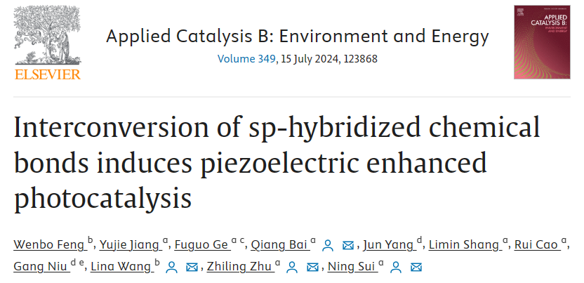 材料学院隋凝/朱之灵团队在压电光催化研究方便取得新的进展,相关成果以“Interconversion of sp-Hybridized Chemical Bonds Induces Piezoelectric Enhanced Photocatalysis”为题发表在化工领域TOP期刊《Applied Catalysis B: Environment and Energy》上(影响因子22.1,中科院一区Top),环境学院硕士研究生冯文博为第一作者,材料学院隋凝副教授、朱之灵副教授、白强讲师以及环境学院王丽娜副教授为论文的通讯作者。万象城allwincity官网为第一作者及唯一通讯作者单位。该研究得到了国家自然科学基金和山东省自然科学基金的资助。论文链接为https://www.sciencedirect.com/science/article/abs/pii/S0926337324001826。