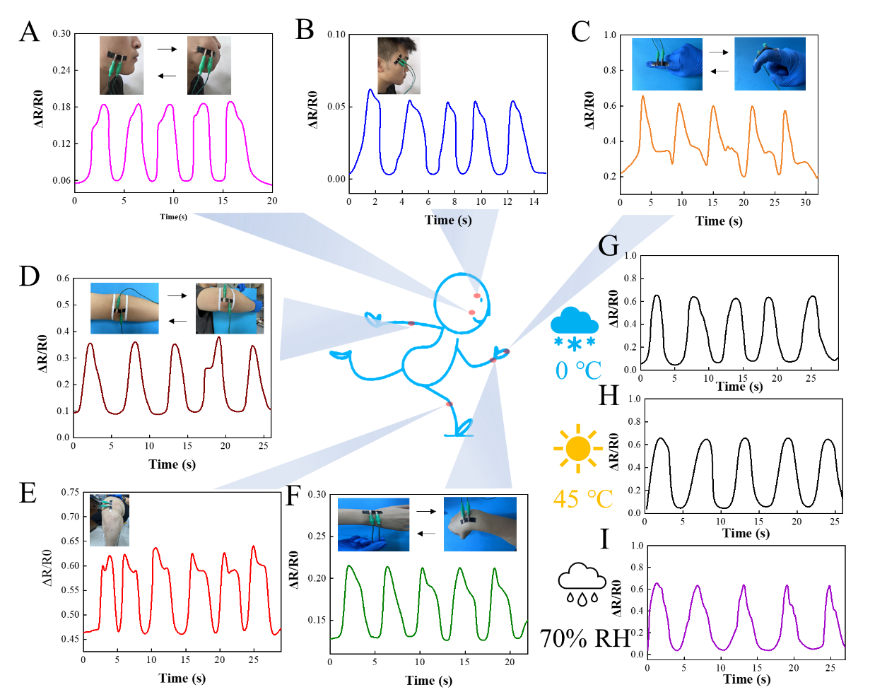 图2 应变传感器对各种人体活动的响应模式。(A)面部运;(B)眨眼;(C)手指弯曲;(D)伸直弯曲的肘部;(E)屈膝;(F)手腕弯曲;手指在不同环境下弯曲(G)低温0℃;(H)耐高温45℃;(I)70%湿度。