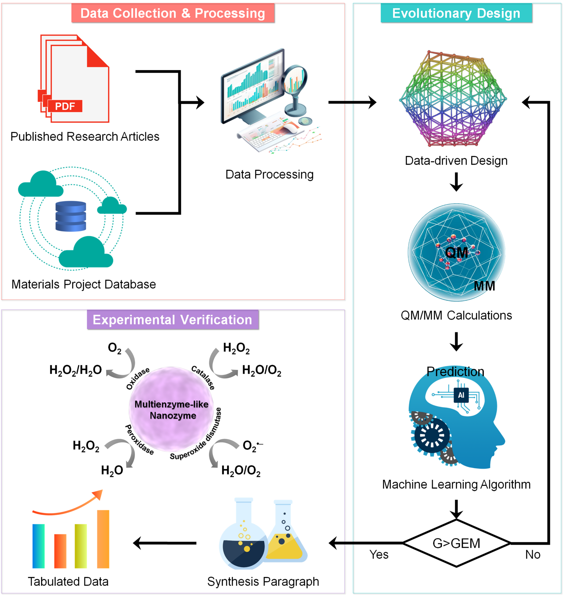 图1.数据驱动多酶活性纳米酶进化设计的过程流程图。