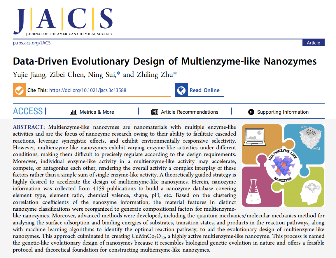 为了解决多酶活性纳米酶理性设计的问题,本研究提出了一种基于数据驱动的“进化设计”方法,通过模拟自然界生物遗传进化的过程,为构建多酶活性纳米酶提供了一种创新的设计策略和理论基础。本研究以"Data-Driven Evolutionary Design of Multienzyme-like Nanozymes"为题发表在Journal of the American Chemical Society(中科院1区TOP期刊,影响因子15.0)。作者建立了一个包含元素类型、比例、化学价、形貌、催化条件等信息的纳米酶数据库。通过对这些纳米酶信息进行相关分析和聚类,作者重新组织了不同纳米酶分类中的物质特征,为多酶活性纳米酶的设计提供了基础。基于量子力学/分子力学方法(QM/MM)和机器学习算法,作者分析了底物的表面吸附能和结合能,识别了最佳的反应途径,辅助多酶活性纳米酶的进化设计。最终,通过这一方法成功创建了一个高活性的多酶活性纳米酶(CuMnCo7O12)。