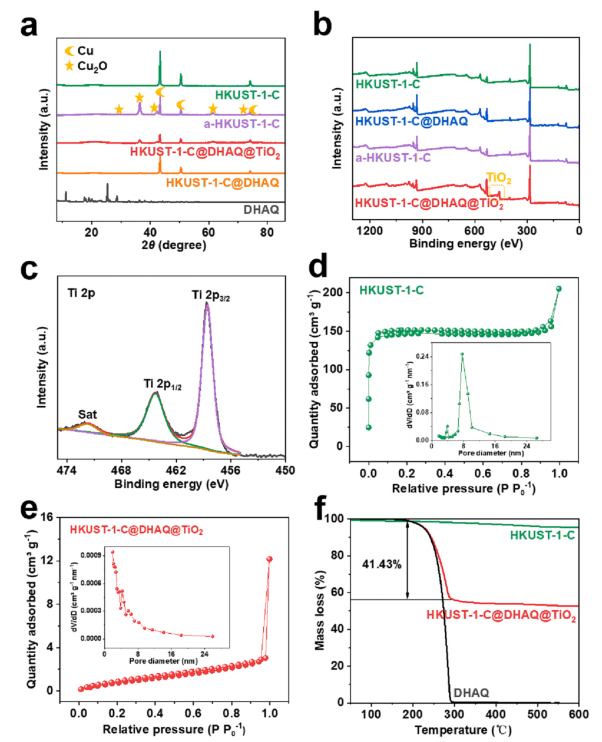 图2 (a) DHAQ、HKUST-1-C、a-HKUST-1-C、HKUST-1-C@DHAQ和HKUST-1-C@DHAQ@TiO2复合材料的XRD图。(b) HKUST-1-C、aHKUST-1-C、HKUST-1-C@DHAQ和KUST-1-C@DHAQ@TiO2的XPS光谱。(c) HKUST-1-C@DHAQ@TiO2复合材料Ti 2p的高分辨率XPS光谱。(d) HKUST-1-C和(e) HKUST-1-C@DHAQ@TiO2复合材料的氮吸附-解吸等温线,插图显示了相应的孔径分布。(f) DHAQ、HKUST-1-C和HKUST-1-C@DHAQ@TiO2复合材料的热重曲线。
