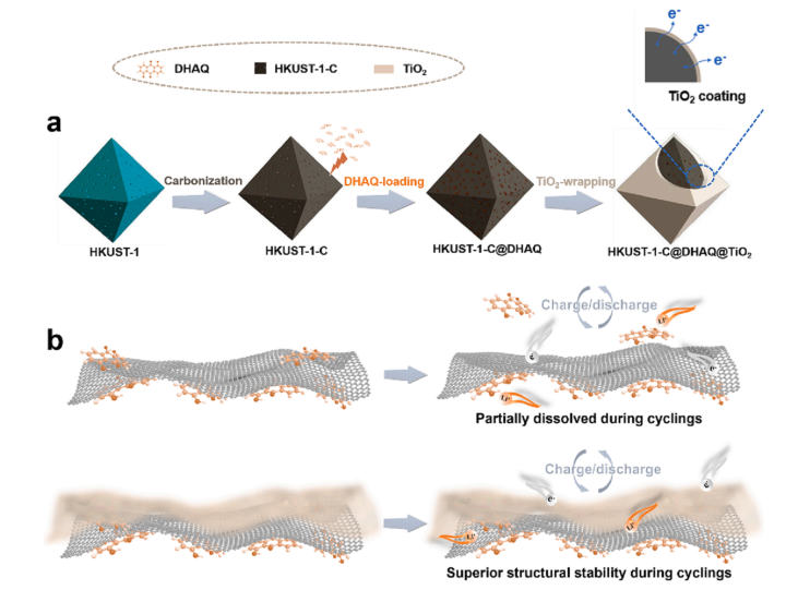 图1(a)HKUST-1-C@DHAQ@TiO2的合成路线,以及(b)HKUST-1-C@DHAQ和HKUST-1-C@DHAQ@TiO2复合电极在电池循环过程中的结构演变。