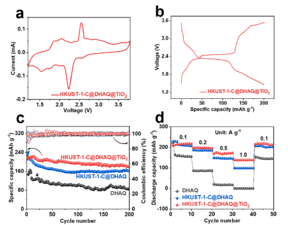 图3 (a) HKUST-1-C@DHAQ@TiO2和(b) HKUST-1-C@DHAQ@TiO2正极材料的CV曲线。(c) DHAQ、HKUST-1-C@DHAQ和HKUST-1-C@DHAQ@TiO2正极材料的循环性能图。(d) DHAQ、HKUST-1-C@DHAQ和HKUST-1-C@DHAQ@TiO2正极材料的倍率性能。