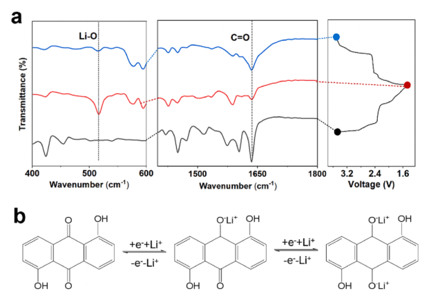 图4 (a) HKUST-1-C@DHAQ@TiO2正极材料的傅立叶变换红外分析。(b) DHAQ中Li+可逆嵌入/脱出机制示意图。