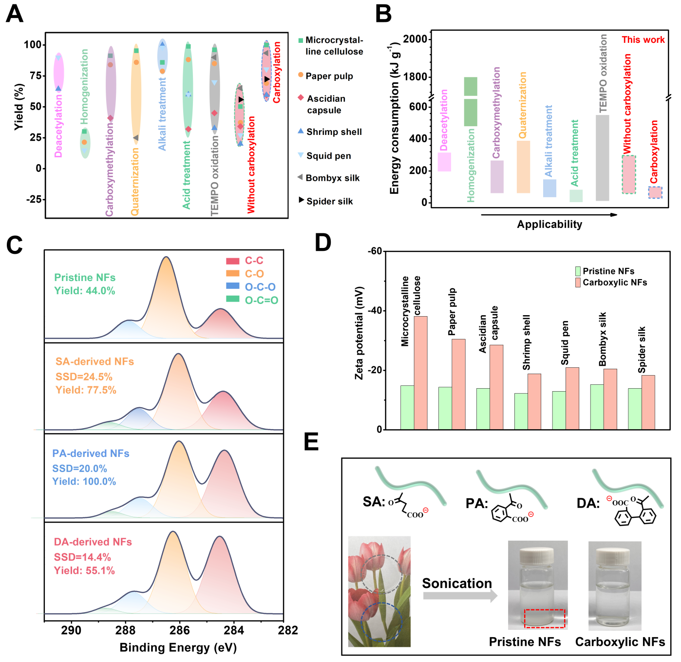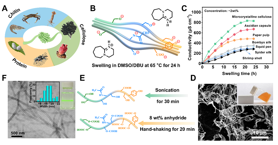 近日,万象城allwincity官网张建明团队陈玉伟副教授与中国科学院青岛能源所李朝旭研究员等合作开发了一种具有普适性的生物质纳米纤维绿色制备方法。该制备方法主要利用1,8-二氮杂双环[5.4.0]十一碳-7-烯(DBU)的二甲亚砜(DMSO)作为一种通用的、可回收的、非侵入性的去质子化溶剂体系,对不同多糖或氨基酸基生物质材料进行夺质子化处理,并配合后期高压均质等强物理剪切作用制备生物质纳米原纤维。同时,依赖于DBU的酯化催化特性,该溶剂体系还可以活化生物质表面羟基,促进其与酸酐反应制备羧基化纳米纤维。