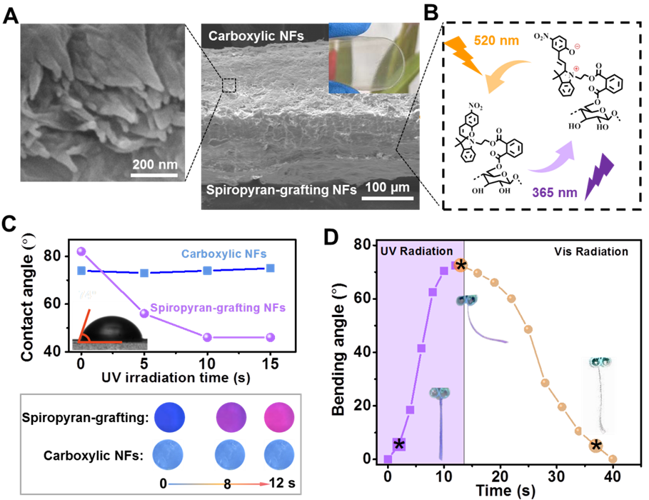 此外,为了进一步拓宽生物质纳米纤维的使用场景,团队以微晶纤维素为例,在DBU/DMSO体系中,加入羟基螺吡喃与4-二甲氨基吡啶(DMAP)和1-乙基-(3-二甲基氨基丙基)碳酰二亚胺(EDC),再次利用DBU的催化作用制备了一种兼具光响应性和湿度响应性的功能化生物质纳米纤维.通过荧光发射光谱和紫外可见光光谱表征了,在羧基化的基础上,接枝有螺吡喃的纳米纤维可以在紫外光(365nm)照射下实现由蓝色到红色的循环荧光颜色转变。同时,依赖于紫外光照下螺吡喃的SP与MC结构转换,纳米纤维薄膜还具有光响应性的亲疏水变化。