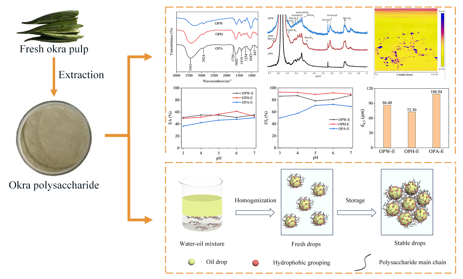 近期,海洋科学与生物工程学院李银平副教授在秋葵多糖稳定的水包油乳液领域取得了一定的进展。相关成果成功设计并制备了三种RG-I含量高的秋葵多糖乳化剂。研究发现,通过酸提取的秋葵多糖乳化性能显著优于商用柑橘果胶和甜菜果胶。此外,在较宽的pH范围以及较低的浓度下,该乳化剂均能表现出良好的乳化活性。因此,秋葵多糖是一种极具发展前景的天然乳化剂,该研究也可以在一定程度上推动秋葵的产业升级。