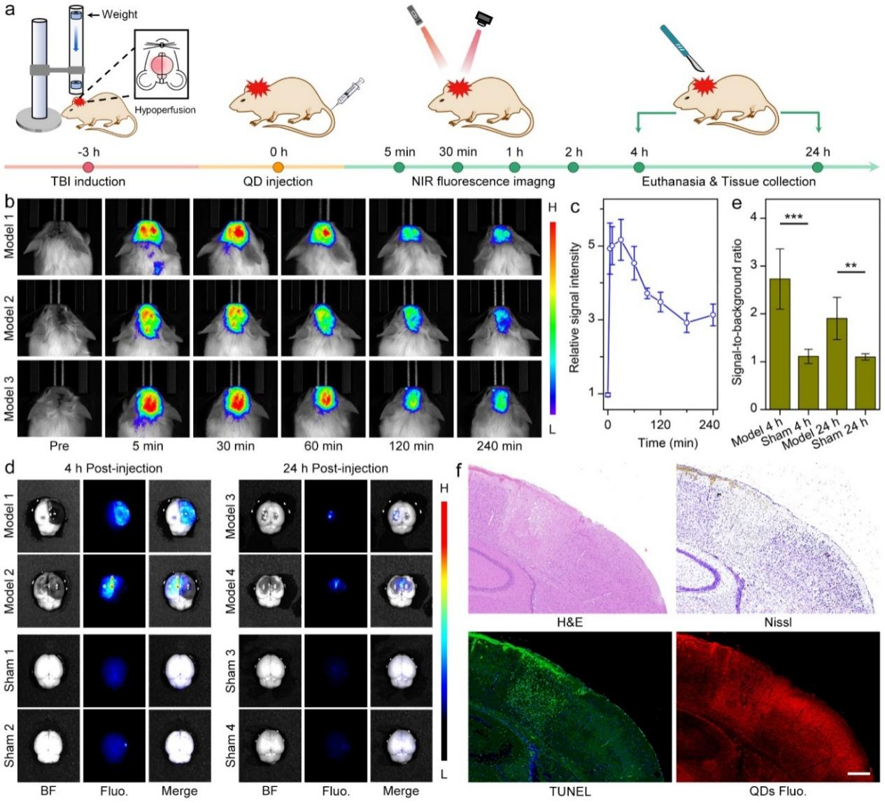 图3. 基于近红外发射、聚乙二醇修饰的铝掺杂Ag-In-Se@ZnS量子点实现TBI精准在体/离体可视化评估。