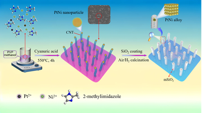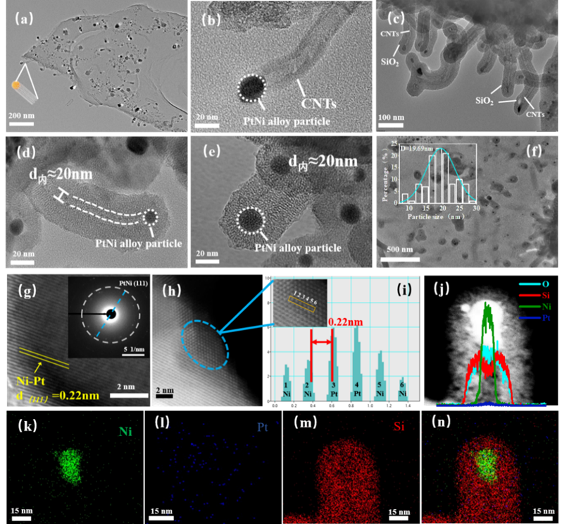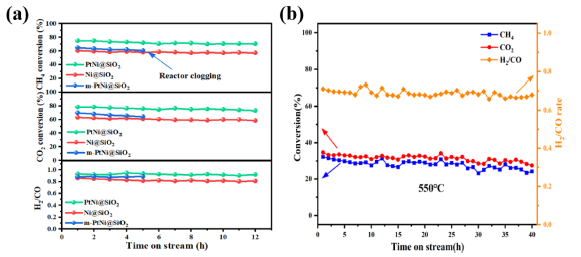 课题组通过顶端生长碳纳米管(CNTs)模板策略,成功制备了单核PtNi alloy@SiO2通道(d≈20nm)催化剂(PtNi@SiO2)。该催化剂独特的单核核壳结构有效阻止了金属颗粒的迁移和团聚。在550℃下,PtNi@SiO2在DRM反应中的CH4和CO2转化率分别达到了31.5%和34.1%,经过40 h的稳定性试验,几乎没有观察到金属烧结现象。此外,在700℃下12 h的DRM稳定性试验中,PtNi@SiO2仍然保持着较高的反应物转化率(XCH4=72.81%, XCO2=75.49%)和催化稳定性。