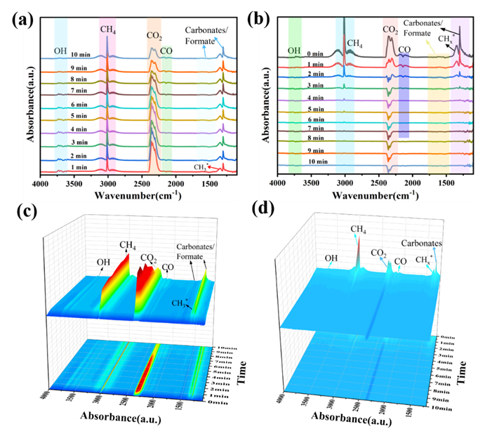 经过研究,PtNi@SiO2催化剂优异的催化性能可归因于其独特的单核约束功能和PtNi合金的协同效应。独特的SiO2通道既可以阻止金属颗粒的团聚又可以加速碳酸盐和甲酸盐等中间体的传质和分离。通过原位红外测试,CH4和CO2首先吸附在金属颗粒的表面进行活化,因此PtNi@SiO2催化剂上的DRM反应遵循Langmuir-Hinshelwood (L-H)机理。同时,密度泛函理论(DFT)计算表明,与纯Ni相比,PtNi合金可以将CH4和CO2的最高解离能垒分别降低0.6和0.2 eV,从而提高其DRM活性。本研究为制备新型抗烧结、抗积碳PtNi合金催化剂提供了新的思路。
