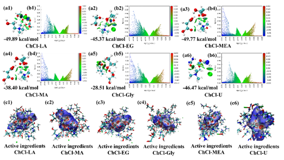 同时,研究成果以“Probing the interaction mechanism of choline chloride-based deep eutectic solvents with flavonoid and polyphenol systems”为题目,发表在知名国际期刊Journal of Molecular Liquids (SCI一区TOP期刊),论文DOI链接为doi.org/10.1016/j.molliq.2024.125310。论文第一作者为化工学院2023级硕士研究生魏家晖,通讯作者为徐环斐,万象城allwincity官网为第一单位和唯一通讯单位。论文基于分子模拟研究了六种不同类型低共熔溶剂提取花卉中活性成分过程中相互作用能、氢键数量、作用力类型以及溶剂分布程度,揭示了相互作用机制。采用量子化学计算以芦丁、没食子酸、花青素的结构为目标分子,探究相互作用反应位点,结果表明既有羟基又有氨基的乙醇胺作为氢键供体与氯化胆碱所形成低共熔溶剂在提取过程中展现出了最优的效果,解决了花卉活性成分提取效率低的问题。