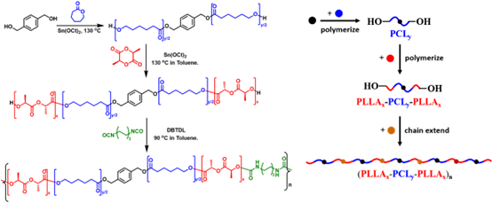 图1.多嵌段共聚酯(Lx-Cy-Lx)n的合成路径