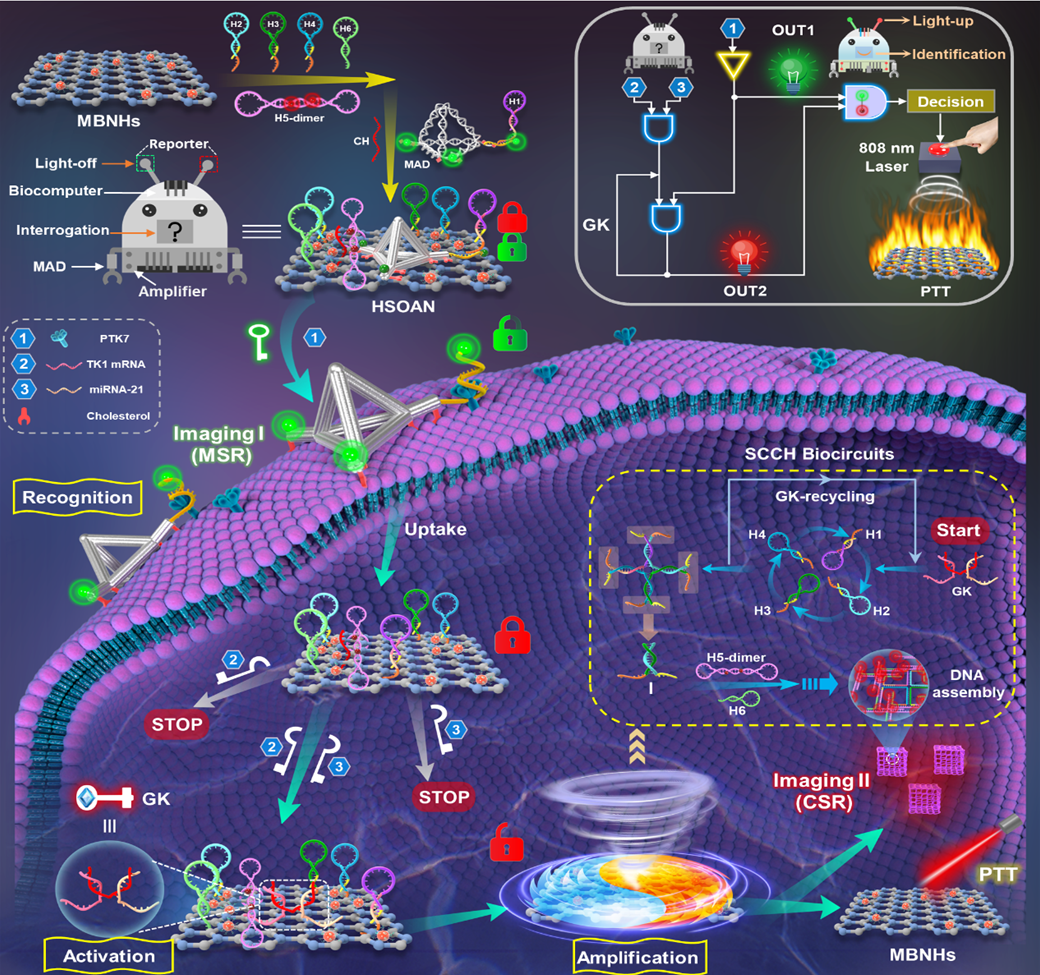 面对这些问题,万象城allwincity官网化学院周宏教授、何鹏副教授团队在Chemical Engineering Journal(IF=13.3)发表了题为“Intelligent Operation-Activated Dual Light-Up Nanointerrogator for On-Site High-Performance Bioimaging”的研究。团队开发了一种智能“分层扫描-运算-自动反馈”纳米询问器(HSOAN),用于精确的细胞识别和个性化光疗。将“生物计算机”与“电路放大器”有效结合,并选择多种生物标志物作为计算输入,基于“YES-ANDI-ANDII”逻辑门顺序感应膜蛋白 PTK7 和细胞质 TK1 mRNA 和 microRNA-21 基因。经历自上而下的扫描-识别,纳米询问器仅在具有三位生物编码的靶细胞中实现空间特异性双色信号输出。研究表明“双锁-三钥匙-双报告器”控制的纳米询问器提高了细胞识别的准确性。工程化框架支撑的膜锚定装置和放大电路介导的超支化组装增强了成像信息的稳定性。 而且,MBNHs的高光热转换效率和生物安全性为肿瘤定制化治疗提供了优异的治疗效果。