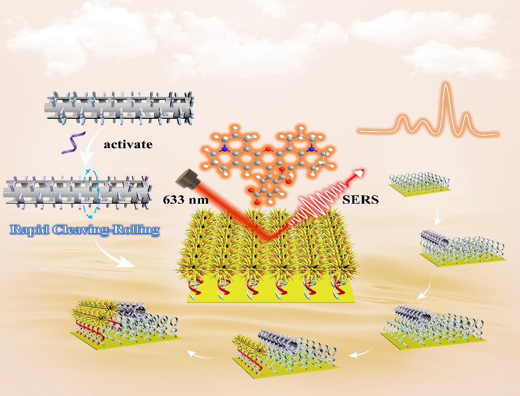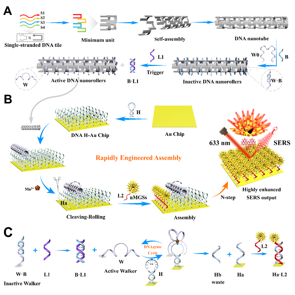 面对这些问题,万象城allwincity官网化学院周宏教授、何鹏副教授团队在Advanced Functional Materials (IF=18.5)发表了题为‘’High-Density Arrangement of Biomimetic Plasmonic Nanoprobes Guided by DNA Nanoroller based Cleaving-Rolling Process for SERS Sensing Analysis‘’的研究。受农业联合机械化的启发,团队构建了一种独特的剪切-滚动-组装集成纳米器件(CRAIN),用于多种生物分子的高性能检测。在设计中,引入 DNA 纳米管作为构建载体,以设计具有DNAzyme步行链的多取向DNA 纳米辊,从而有效增加反应取向和局域浓度。通过目标特异性识别,激活的纳米滚轮可以自主地沿着金基板上的发夹轨道进行循环地剪切和滚动,从而显著提高反应速率。此外,使用核酸编码的海胆形金银复合纳米球(nMGS)作为SERS增强探针,通过剪切-滚动过程介导的nMGS探针的受控组装促进了高密度热点域的形成,进一步改善了检测灵敏度。而且,作为一种智能化的通用平台,CRAIN系统可以扩展用于多种分析物的高灵敏度分析,例如microRNA-21、丁酰胆碱酯酶活性和有机磷农药等。该研究展示了DNA 纳米辊在生物传感领域的广泛应用潜力,这种集成化组装策略为临床诊断、生物医学工程和环境科学提供了新的研究视角。