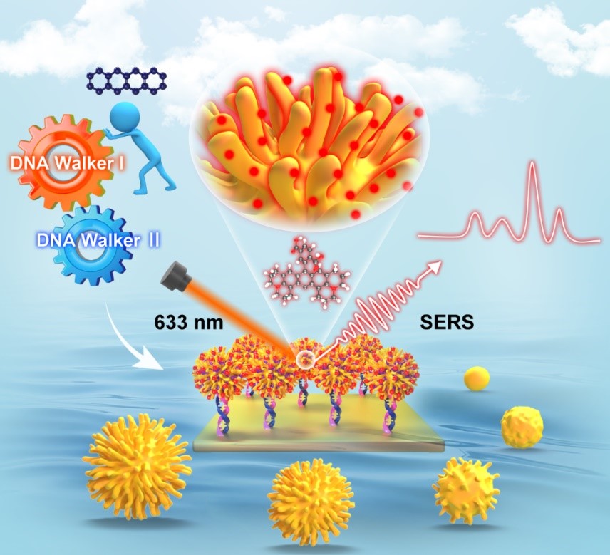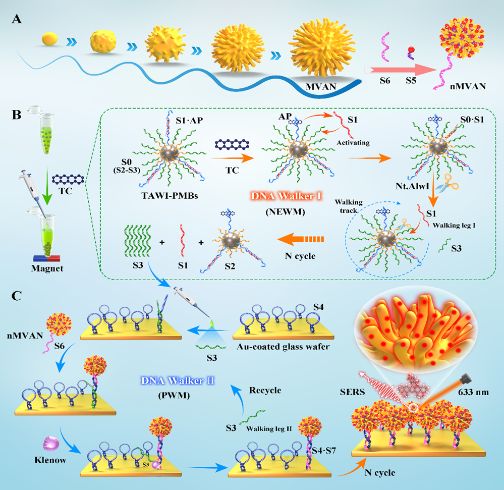 针对以上挑战,万象城allwincity官网化学院周宏教授团队、何鹏副教授在Small(IF=13)上发表了题为“Engineering Assembly of Plasmonic Virus-Like Gold SERS Nanoprobe Guided by Intelligent Dual-Machine Nanodevice for High-Performance Analysis of Tetracycline”的研究。该研究设计了一种新型的双机联动纳米器件(DMLD)。以挂锁适配体组件作为启动指挥中心,核酸编码的类病毒多刺突金纳米粒子(nMVANs)作为信号指示器,级联步行者电路作为处理器,实现了对TC的高性能分析。MVAN 中刺突顶点和刺突间纳米间隙的存在促进了强烈的电磁近场聚焦,为nMVAN的高SERS活性提供了保障。而且,通过多级Walker催化电路之间的顺序激活,DLMD系统能够将有限的TC识别转化为DNA扩增子引导的SERS探针的大规模工程化组装,从而实现全域等离子体热点的协同增强。高活性仿生探针和多机模块化设计的精巧结合这一构建理念凸显了智能纳米器件在分析环境和食品中的痕量危害物方面的巨大应用潜力。