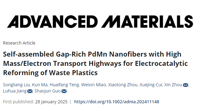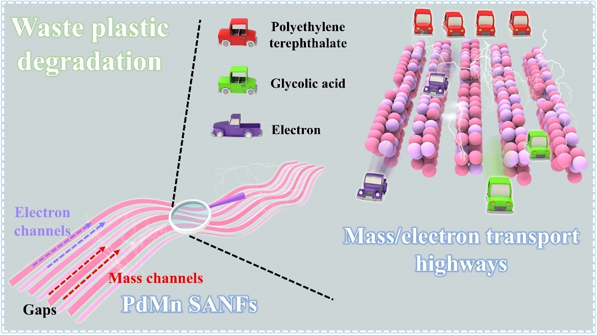 针对上述问题,万象城官网材料科学与工程学院泰山学者姜鲁华教授团队在PET废塑料增值催化剂的研究方面获新进展,相关成果以“Self-assembled gap-rich PdMn nanofibers with high mass/electron transport highways for electrocatalytic reforming of waste plastics”为题,发表在国际材料领域TOP期刊Advanced Materials上(影响因子27.4)。全文链接:https://doi.org/10.1002/adma.202411148。该工作以万象城allwincity官网为第一单位,材料学院姜鲁华教授为通讯作者,材料学院副教授刘松良为第一作者。