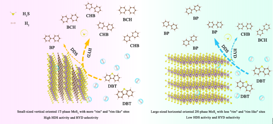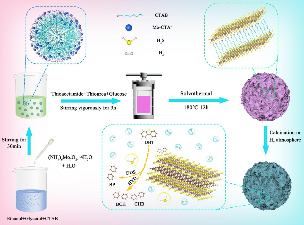 目前,世界各国对石油能源的依赖程度依旧很高。但是为了应对原油重质化和劣质化的趋势以及愈发严峻的环境污染问题,世界各国已设立了相关的法案以限制柴油中的硫含量,超低硫柴油(ULSD)的生产研究已成为科研工作者研究的热点。加氢脱硫(HDS)工艺作为生产ULSD的主要手段,其催化剂活性相的定向构建尤为关键。目前常用的MoS2基催化剂由于其有限的活性位点和半导体性质,严重限制了其HDS性能。而1T-MoS2扭曲的八面体结构和独特的类似于金属的性质使其具有了更大的层间距以及更高的电子传输性能。上述1T相结构的优异性质使得MoS2基催化剂实现超深度HDS成为可能。基于上述能源背景,化工学院黄婷婷副教授在Journal of Catalysis期刊发表题为“Targeted fabrication of 1T-MoS2enriched nanosheets vertically oriented on spiny-shaped nanospheres with sufficient sulfur vacancies and “rim” sites for co-enhancing the hydrodesulfurization activity and hydrogenation selectivity”的研究论文,研究生武文哲为第一作者,黄婷婷副教授为通讯作者。