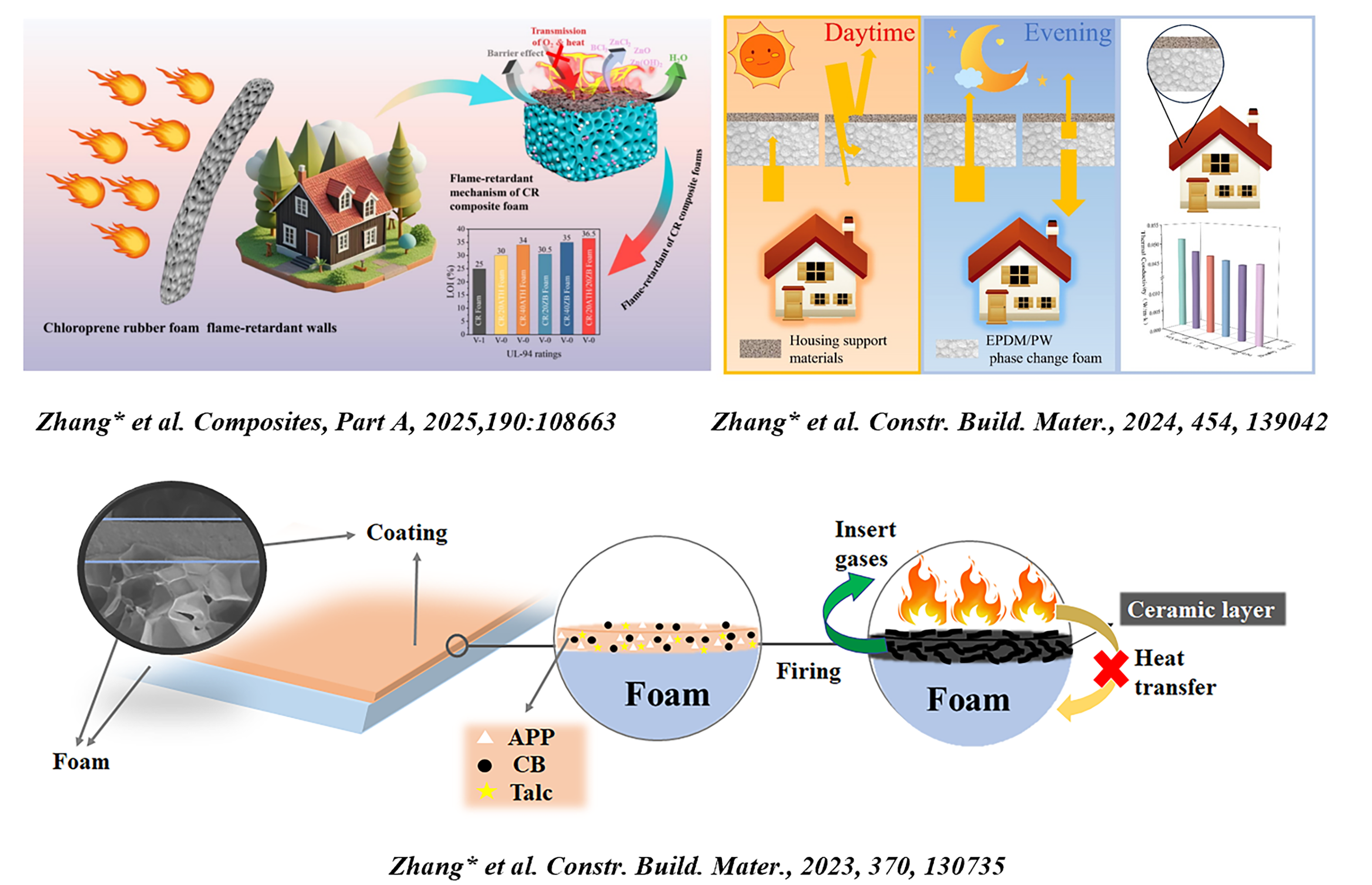 团队开发了具有陶瓷化阻燃涂层的硅橡胶复合发泡材料,密度在0.08 ~ 0.23 g/cm3可调。滑石粉对陶瓷化有明显的熔融和阻燃作用,熔融晶体结构将APP和CB凝聚在一起,最终形成具有更高抗弯强度的陶瓷,从而提高了阻燃性能和陶瓷化性能。烧蚀后由于形成了陶瓷化涂层,抗压强度比纯硅橡胶涂层提高了900%。相关成果以“Lightweight and flame retardant silicone rubber foam prepared by supercritical nitrogen: The influence of flame retardants combined with ceramicizable fillers”为题发表于Construction and Building Materials.文章链接:https://doi.org/10.1016/j.conbuildmat.2023.130735. 高分子学院2019级硕士研究生韩迎霞为第一作者,于振博士、张振秀教授为共同通讯作者,万象城allwincity官网为第一通讯单位。